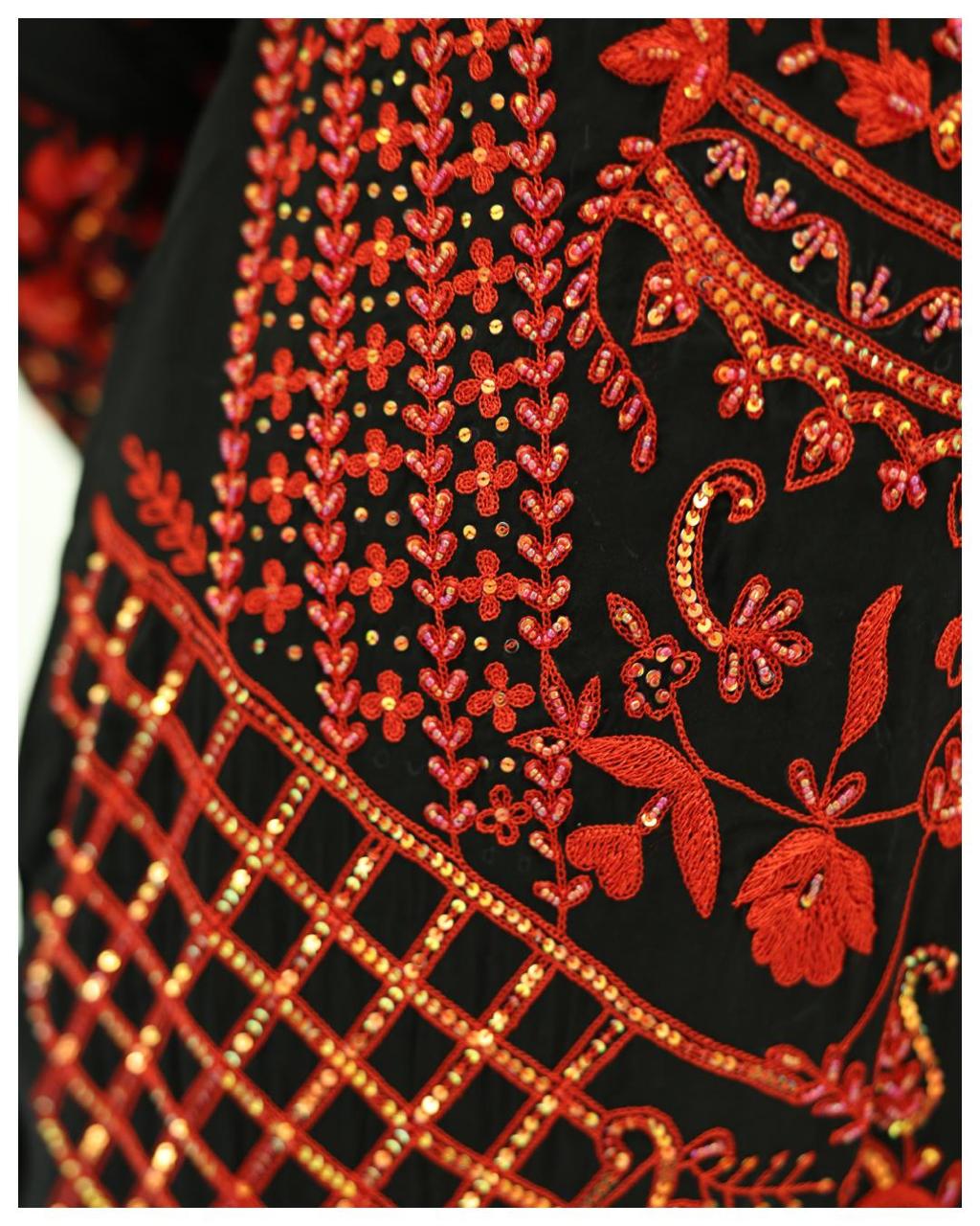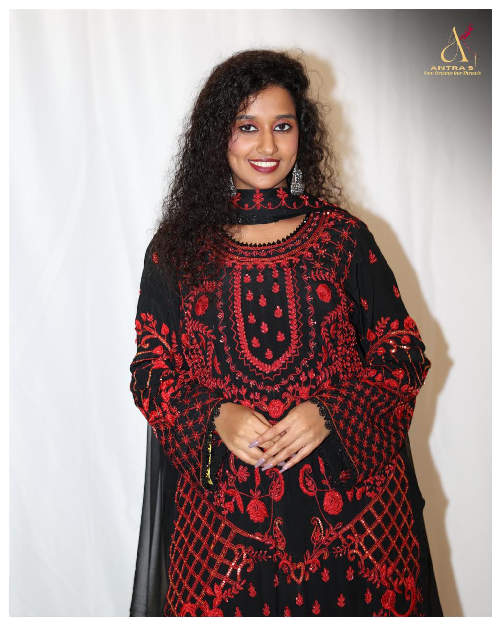A cotton silk ensemble with intricate embroidery all-over, detailed on the front and back. Styled with a pure georgette dupatta and pure silk crushed pants, finished with bold red thread work against a black outfit.